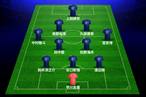 堂安律(フランクフルト/ドイツ)と中村敬斗(スタッド・ランス/フランス)はウイングバック(WB)での起用が予想され、前線には久保建英(レアル・ソシエダ/スペイン)、キャプテンマークを巻く南野拓実(モナコ/フランス)、上田綺世(フェイエノールト/オランダ)らが入る。鈴木彩艶(パルマ・カルチョ/イタリア)不在の中、ゴールマウスを守るのは早川友基(鹿島アントラーズ)となった。