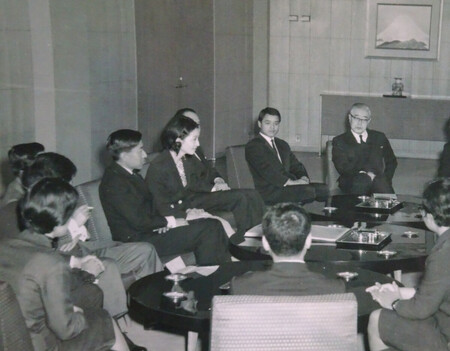 〔写真説明〕青年海外協力隊員らと面会される上皇ご夫妻(当時は皇太子ご夫妻)。右から2人目の男性が隊員第1号の大西規夫さん=1968年3月、東宮御所(現・仙洞御所)(大西さん提供)