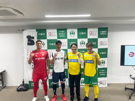 神谷俊一市長は「この記念ユニホームをまとった選手が、J1のステージで躍動する姿を見られることを大いに期待をしている」と語り、鈴木大輔選手は「歴史が詰まったユニホームを着ることにすごく誇りを感じる。このユニホームを着て、日本中、そして世界中に千葉の名をとどろかせたい」と意気込みを語った。【もぎたて便】