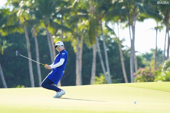 122ヤードからピッチングウェッジで3メートルにつけた10番を皮切りに3連続バーディ。17番パー5では2オンに成功し、「10メートルくらいから入るかと思ったけれど…かすめていっちゃった」とイーグル逃しのバーディを奪った。バックナインでチャンスを量産し、納得の“31”。「気持ちよくラウンドできた。すごくいい流れで終われたのであしたにつながる」と声を弾ませた。