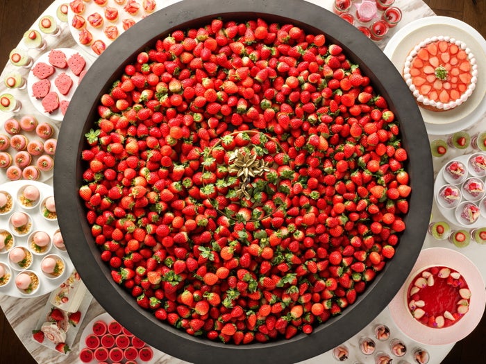 最大の見どころは、“映えスポット”として人気のデザートルーム前に登場する直径約1mの「いちごボウル」だ。神奈川県産を含む国産いちご3種が惜しみなく盛られ、まるで宝石のような輝きを放つ。見た目もインパクト大で、フレッシュないちごそのものの味わいを存分に堪能できる。