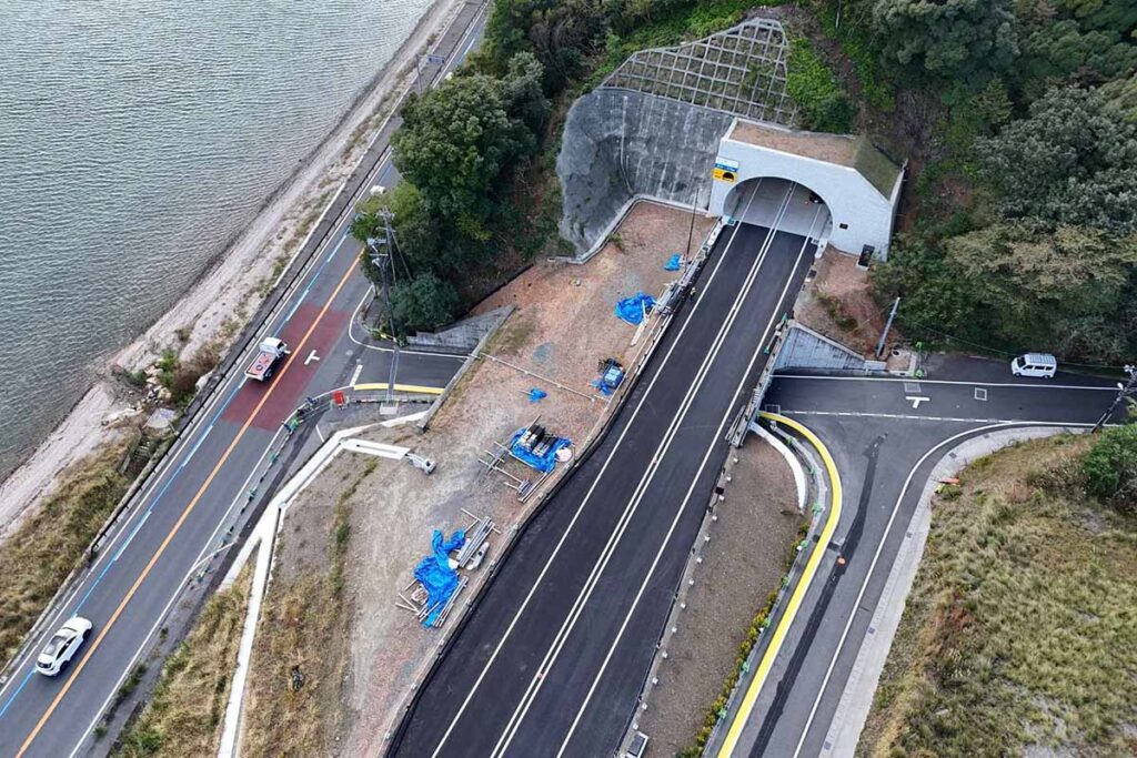 小松拡幅は、バイパス終点の大津市北小松から、さらに北の高島市勝野まで6.5km延長する事業です。今回はこのうち、北小松側の2.4km(14工区)が暫定2車線で開通します。事業名は「拡幅」ですが、現道に並行して新しい道路を新設。現道の渋滞ポイントである北小松交差点を避け、北小松トンネルを経て大津・高島市境の手前に至ります。