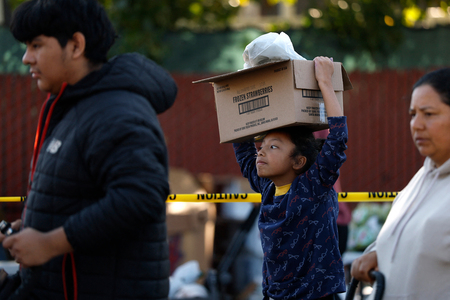 〔写真説明〕米カリフォルニア州オークランドの慈善施設で行われた感謝祭の食料無料配布で、食料の入った箱を頭に乗せて運ぶ少女=24日(AFP時事)