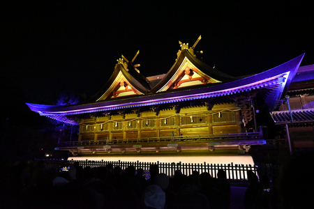 点灯式には、演出を担当した世界的な照明デザイナーの石井幹子さんらが出席。カウントダウンに合わせてスイッチを押すと、本殿と拝殿が金色の光に照らされ、詰めかけた地元住民らは寒さの中、写真撮影を楽しんだ。石井さんは「どんな風な照明にするか悩んだ。この光が皆さんの心に届いたらうれしい」と話した。