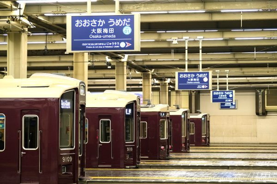 大阪梅田駅は9線10面のホームがあり、マルーンカラーの電車がズラリと並ぶ光景や、ピカピカに磨き上げられたホームの床が名物となっています。