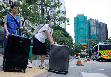 〔写真説明〕3日、香港北部・新界地区大埔で、高層住宅火災の延焼を免れた1棟から貴重品などを持ち出す住民(ロイター時事)