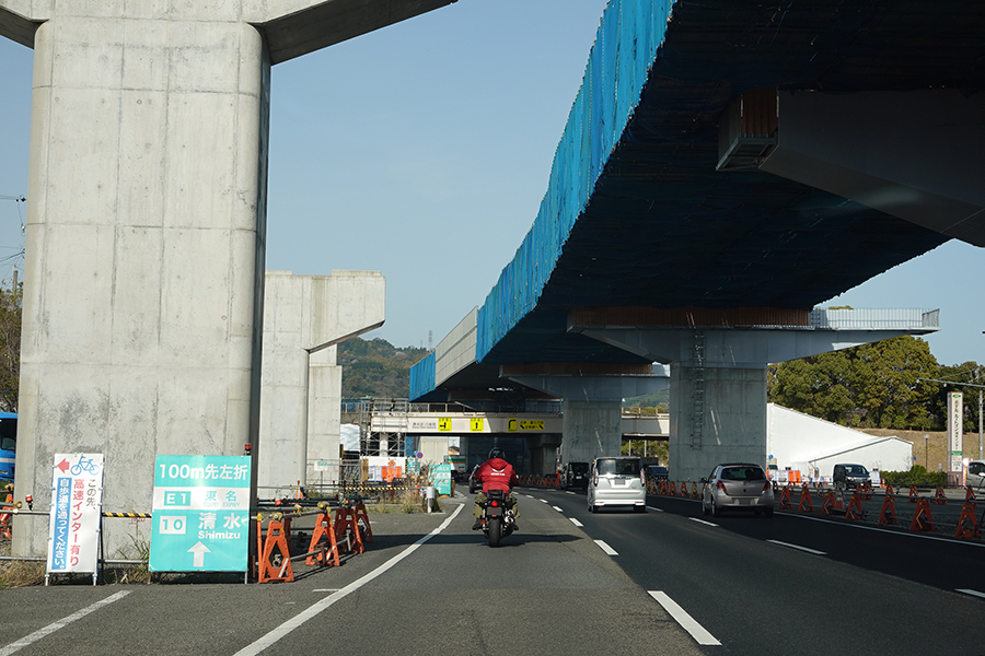 2018年12月に丸子藁科トンネルが完成して全線4車線化が完了。そして現在は、唯一平面区間として残る東名清水IC周辺を高架化する清水立体事業が進行中です。ここは平均旅行速度が20km/hを下回るという強烈なボトルネックとなっています。