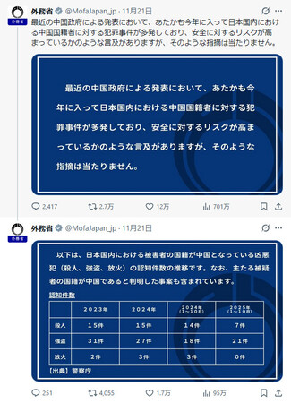 PRだけではない。首相の台湾有事発言を受けて「日本で中国人を狙った犯罪が多発している」と中国政府が「宣伝」すると、外務省は中国人が被害者となった凶悪犯罪の認知件数の表をアップし、「指摘は当たらない」と訴えた。この投稿の閲覧数は日本語だけで700万を超えている。
