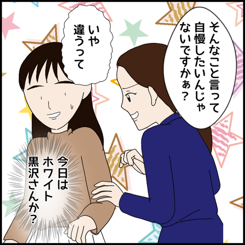 年下の同僚・黒沢さんに彼氏ができたと知り、喜ぶ主人公・白山さん。しかし相手は、自分が一年前に合コンで出会い、猛アピールされていた栗田さんだった。同じ合コンに参加していた赤木さんとその話をしていたところ、黒沢さんが物陰からそれを立ち聞き。翌日には不機嫌な態度を取られるが、翌々日には普段通りに戻っていた。