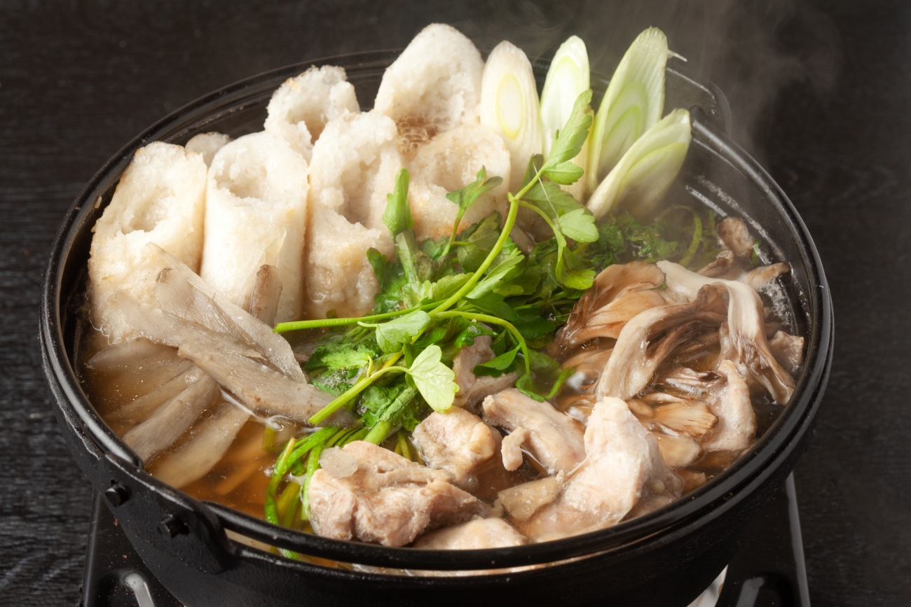 ゴボウはたわしで水洗いして大きめのササガキにし、水に放ってザルに上げる。水煮タケノコは食べやすい大きさのくし切りにする。白ネギは斜め薄切りにする。マイタケ、シメジは石づきを切り落として小房に分ける。セリは水洗いして根元を切り落とし、長さ4~5cmに切る。手綱コンニャクは熱湯でゆで、臭み抜きをしてザルに上げる。