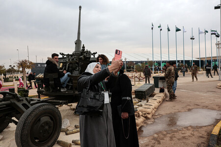 〔写真説明〕6日、シリアの首都ダマスカスで、展示された兵器の前で自撮りする市民ら(EPA時事)