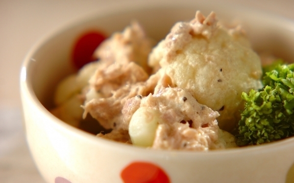 ツナマヨ味のサラダは、野菜が苦手な子どもも食べやすい一品です。カリフラワーはやさしい甘みがあるため、大人は粗びき黒コショウで味を引き締めると風味のバランスが良くなります。水煮コーンなどをトッピングして、見た目も楽しいカラフルサラダにするのも良いですね。