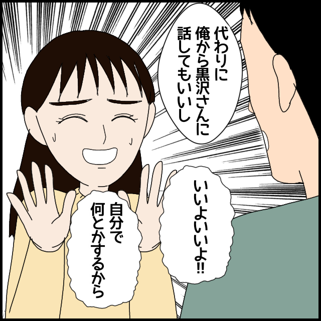 黒沢さんとの関係悪化を恐れて何も言えずにいた白山さんですが、グイグイ来る彼氏のおかげで一念発起。もしも黒沢さんが不機嫌だったら、本音をぶつけようと決意します。