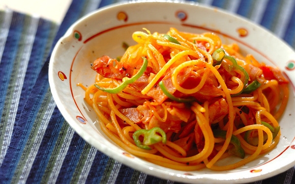 洋食屋さんの味といえばコレ、という方も多いナポリタン。こちらのレシピでは、ウスターソースで酸味をプラスするのがポイントです。ケチャップの甘みと相まって、お店顔負けの味になりますよ。ニンジンやキノコなどを加えて具だくさんにすれば、栄養もボリュームも満足な一皿に。