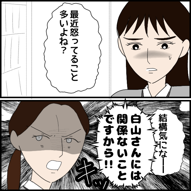 それでも屈せず、最近の機嫌の悪さについて尋ねる白山さん。「関係ない」と言われ、堪忍袋の緒が切れてしまったようで…?