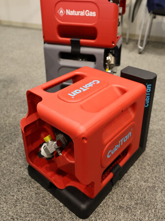 〔写真説明〕金属有機構造体(MOF)を活用して小型・軽量で効率的にガスを運べる次世代型ボンベ「キュビタン」=11月5日、京都市左京区