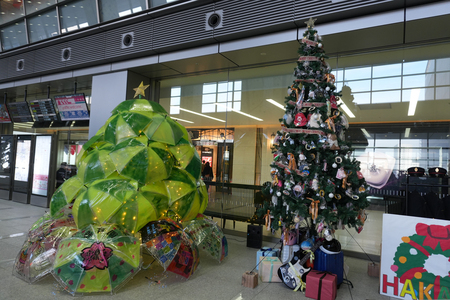 JR博多駅(福岡市博多区)で、処分予定の落とし物や忘れ物(遺失物)で飾った二つのクリスマスツリーが登場した。地元の保育園児らが、一つは塗装した傘で、もう一つはぬいぐるみやハンディーファン、ギターなど約200個の遺失物をオーナメントやプレゼントに見立てて飾り付けた。設置最終日の25日以降は、遺失物を希望する利用者などに配布する予定。