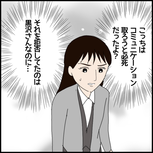 白山さんがキレると、黒沢さんは焦って謝罪。しかし数日後、赤木さんから「もう少し黒沢さんのフォローをしてあげて」と指導される。すでに黒沢さんの3倍量の作業をこなしているにもかかわらず、「黒沢さんが可哀そう」と言われてしまい…。
