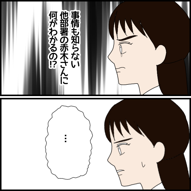 白山さんがキレると、黒沢さんは焦って謝罪。しかし数日後、赤木さんから「もう少し黒沢さんのフォローをしてあげて」と指導される。すでに黒沢さんの3倍量の作業をこなしているにもかかわらず、「黒沢さんが可哀そう」と言われてしまい…。