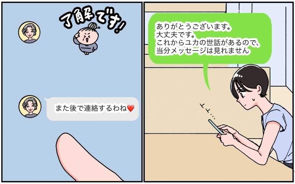 毎日、毎日、義母からのメッセージに迷惑しているミツキ。夫は気軽に「無視しろ」と言いますが、嫁の立場では出来ずにいました。ミツキももうすぐ職場復帰となるため、もう少しだけ…そう考えて我慢してきました。そんな矢先、朝早くから鳴り響く通知音に…。