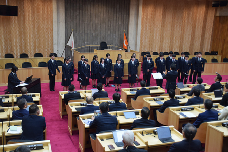 福島県議会は、完成した新議場で初めてとなる12月定例会の開会日に合わせて、議場開場記念行事を行った。県立橘高校の合唱部が本会議を見学した後、演奏を披露した。