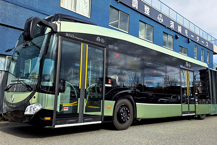 車両は全長約18mのメルセデス・ベンツ製連節バス「シターロG」1両を使用。定員は122名です。公開された車両「SRT-001」は2軸目、3軸目のタイヤが“スパッツ”で覆われ、ほぼボディに隠れており、路面電車のような外観が強調されています。
