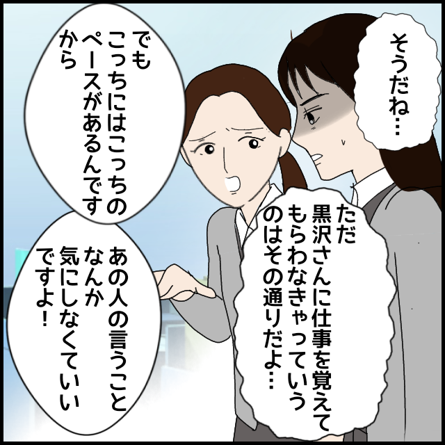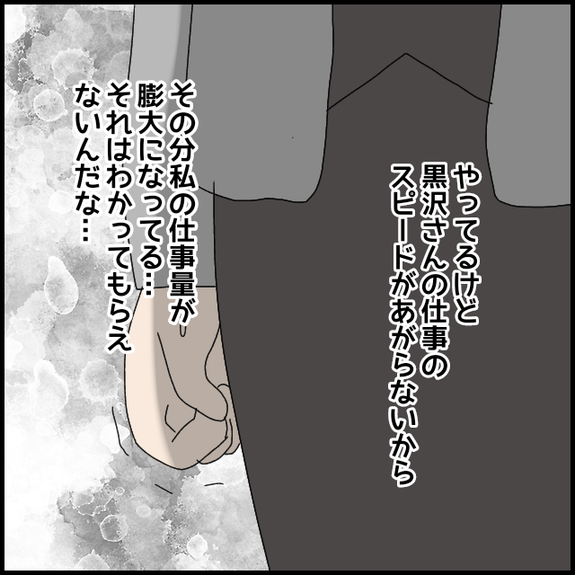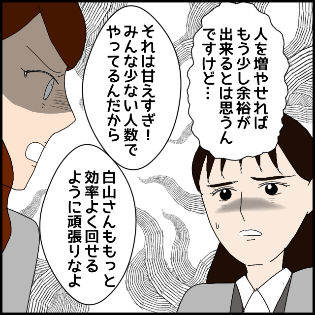 仕事の遅い黒沢さんを精一杯フォローしているのに、「もっと効率よく回せるように頑張りなよ」と赤木さん。ギュッとこぶしを握って耐えている白山さんが、可哀そうでたまりません…。