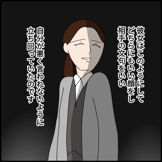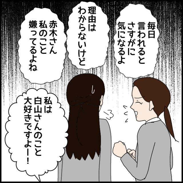 ある日、上司が黒沢さんの仕事の遅さを指摘。同調した赤木さんを、黒沢さんはいじめだと敵視するようになる。白山さんは仲を取り持とうとするが、なぜか赤木さんから「もっと黒沢さんをフォローして」と指導される。実は、黒沢さんは赤木さんに「白山さんが仕事を教えてくれない」と嘘をつき、自分の味方につけていたのだった。