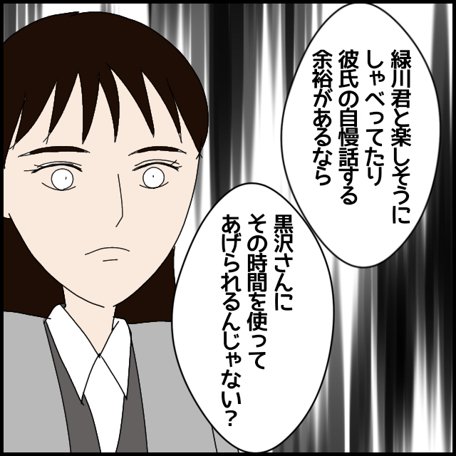 ある日、上司が黒沢さんの仕事の遅さを指摘。同調した赤木さんを、黒沢さんはいじめだと敵視するようになる。白山さんは仲を取り持とうとするが、なぜか赤木さんから「もっと黒沢さんをフォローして」と指導される。実は、黒沢さんは赤木さんに「白山さんが仕事を教えてくれない」と嘘をつき、自分の味方につけていたのだった。