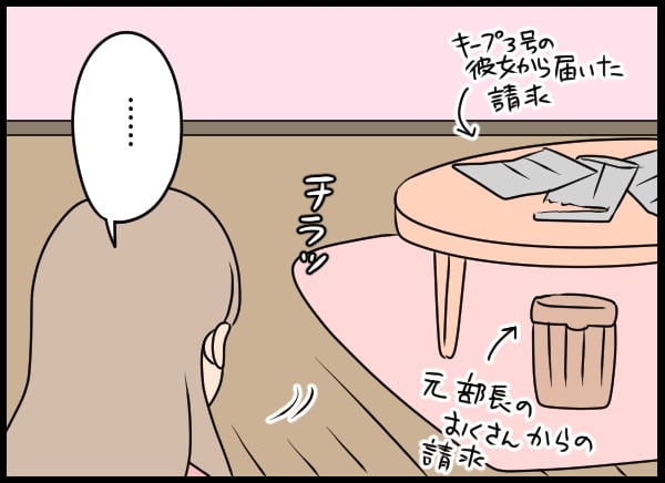 前の話を読む。男性の婚約者から慰謝料を請求された横田。キープしていた男性に振られ、傷心のまま帰宅すると元部長の妻からも慰謝料を請求する手紙が来ており…。