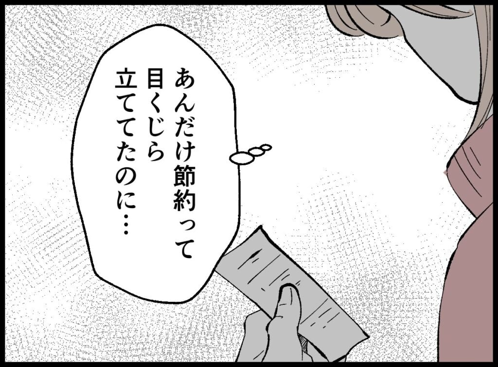 夫の心ない言葉に疲れ切っていた妻は、ひそかに買った宝くじが3億円当選していると知り、このお金は絶対に夫に渡さないと誓う。お茶会を楽しんでいた妻の姿を偶然見た夫は、帰宅後にレシートを出すよう要求する。しかしレシートが見当たらず動揺する妻に、夫は「探しに行けよ」と言い放つ。探しても見つからないと悟った妻は、同じ内容のレシートを持つママ友に助けを求めることに。快く応じてくれたママ友に救われ帰宅するが、たった270円のために人を巻き込み、時間も労力も費やしたことを思うと、どうしてもやりきれない気持ちがこみ上げる。帰宅すると、空になった弁当の容器が目に入り…。
