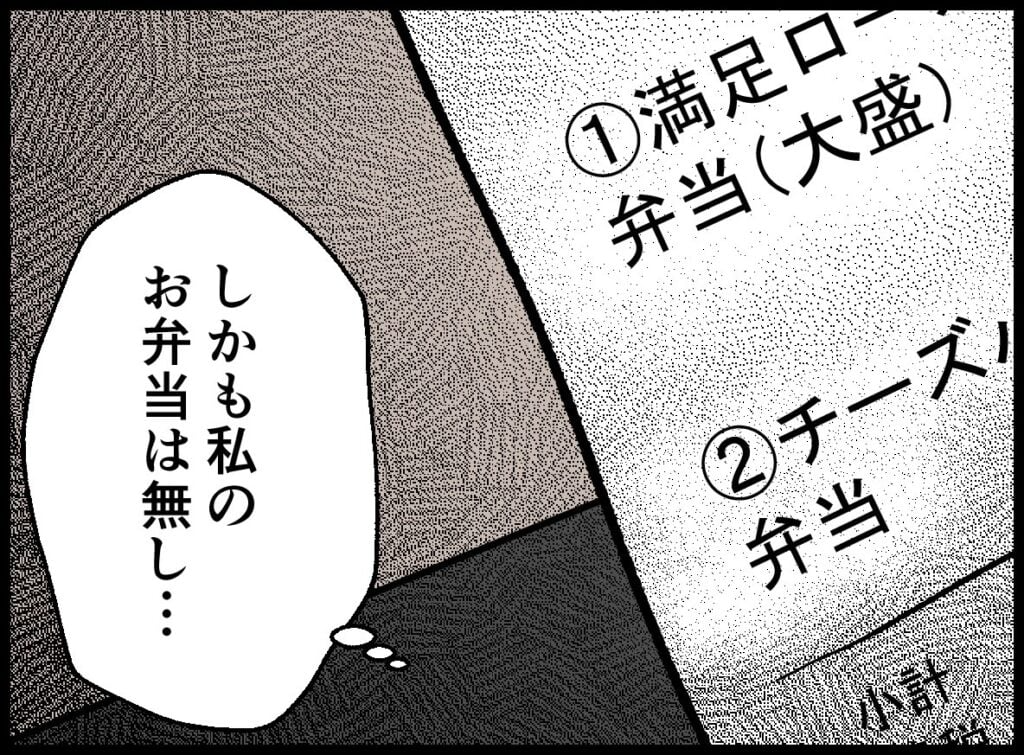 夫が食べたのであろう空の弁当箱がテーブルに残され、レシートには弁当が二つ分だけ。そこに妻の分がないことに、胸の奥に言いようのない気持ちが広がります。