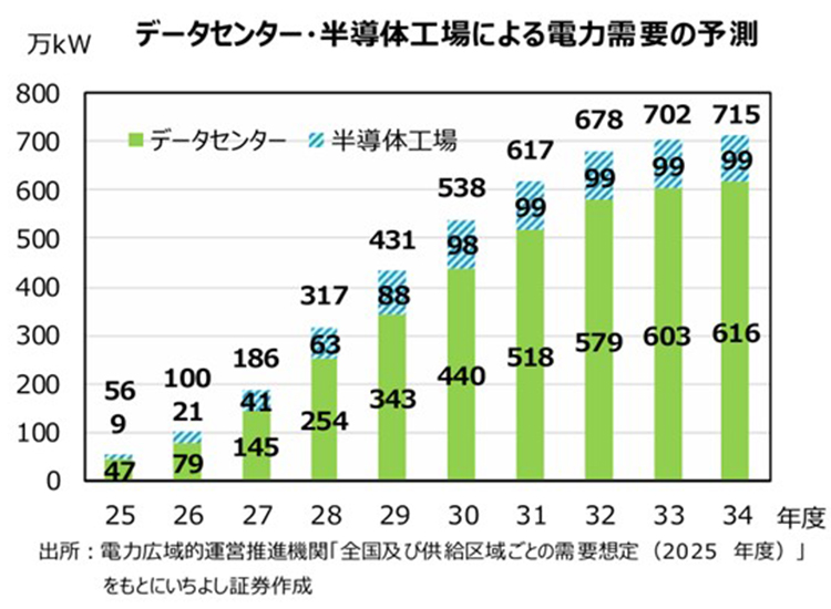 神様:ご存知の通り、生成AIの学習に欠かせないデータセンターや半導体工場の増設により、今後は電力需要の増加が見込まれます。予測では2034年度までに715万kW増加する見込みです。独立行政法人エネルギー・金属鉱物資源機構によれば、データセンターの1拠点あたりの消費電力は約50MW程度です。これは一般家庭の1万~1万6千世帯分に相当する試算です。
