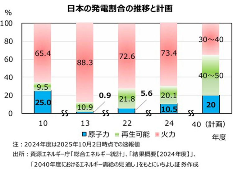 神様:だからこそ、安定した電力供給方法として原子力発電が必要とされているのです。原子力発電の発電割合を見ると、2013年度の約0.9%から2024年度には10.5%まで増加しています。政府のエネルギー基本計画では、2040年に原子力発電の比率を20%程度とすることを目標としています。