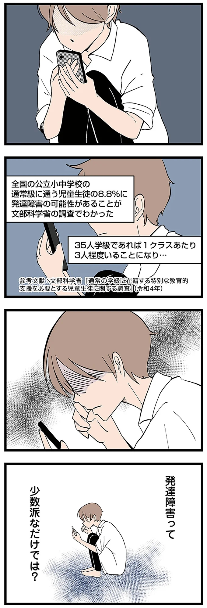 文科省の調査によると、公立小中の通常級に通う子どもの約8.8%に発達障害の可能性があり、1クラスにすると3人ほどの割合になるとのこと。