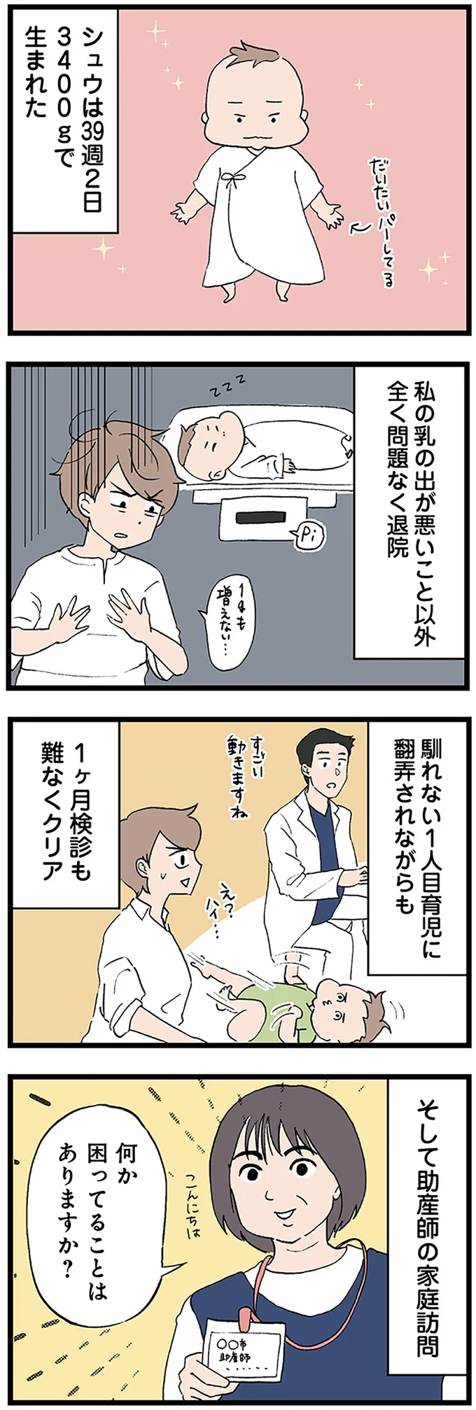 長男シュウは3400gで生まれ、1か月健診では問題はありませんでしたが、抱っこをすると体を反りがちだったり、首が据わる前に寝返りをするなど、心配面はありました。ベビーマッサージで泣き暴れるなど、他の子との違いを実感することもありました。