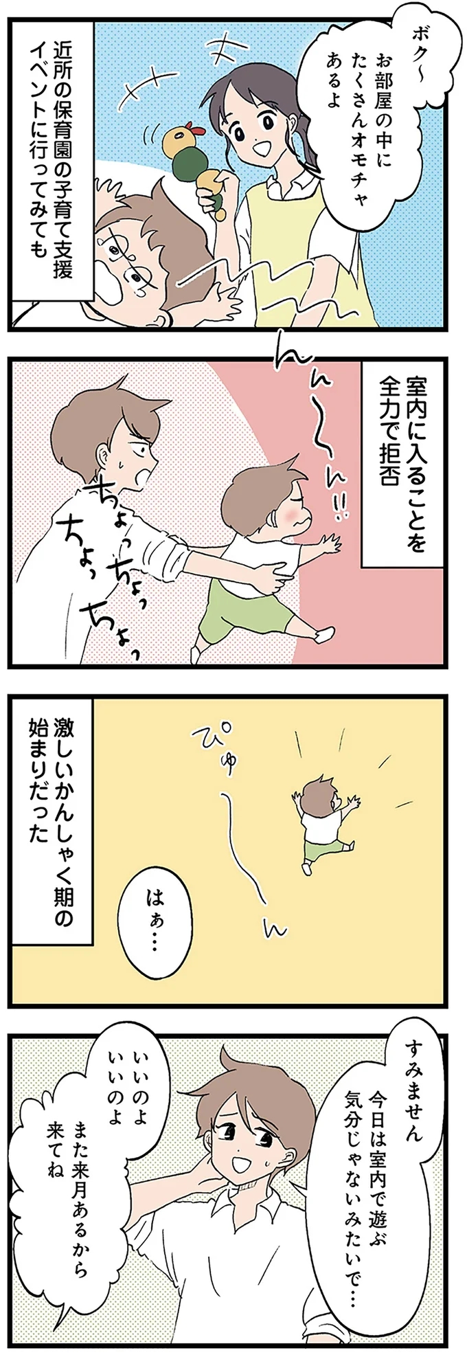 歩き始めたばかりの息子シュウは、保育園の室内遊びや子育て支援のイベントを強く嫌がり、制止を振り切って走り回るようになりました。これは激しいかんしゃく期の始まりでした。