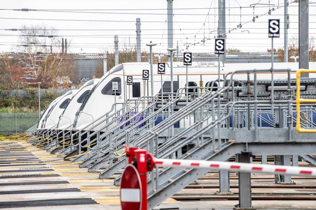 そう思ってしまいますが、よく見ると鉄道車両・設備メーカーの「ALSTOM」という小さな標識があり、ゲートの隙間から車両が並んでいるのがかすかに見えます。筆者が訪れた日は、ちょうどヒースロー空港の一つ手前のヘイズ・アンド・ハーリントン(Hayes & Harlington)駅周辺の線路で不具合があり、間引き運転中だったため、いつもより多い40編成近くが待機していました。