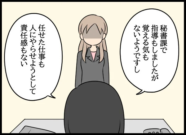 さらには「欲しい人材じゃない。仕事も覚えない、任せた仕事は人にやらせる。責任感がない」と言われ放題。そして「人事課にも”知り合い”がいたんですね」とトドメを刺されます。
