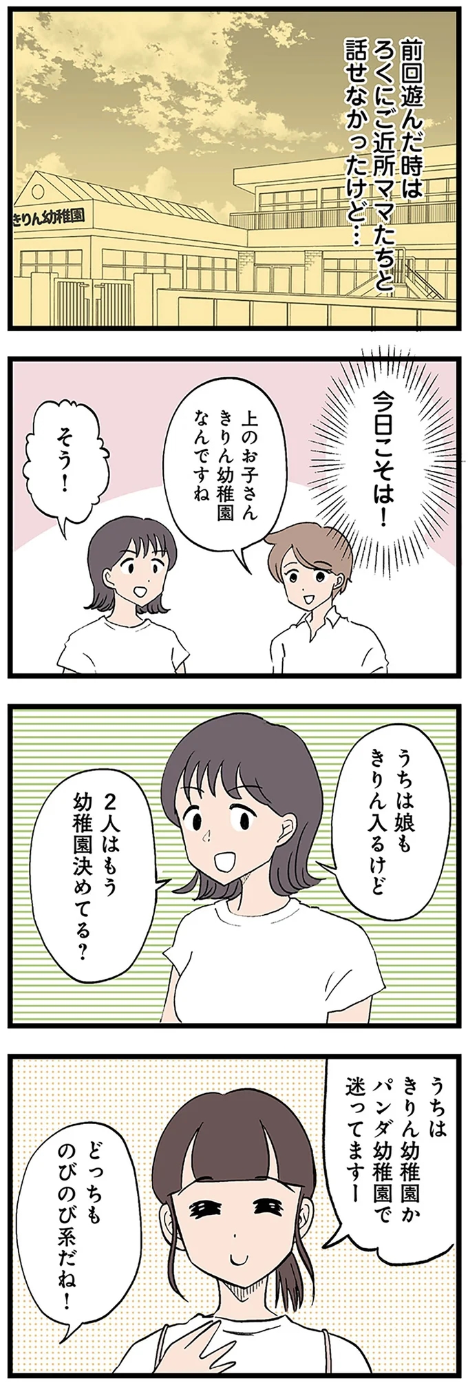 しかし、次回のお誘いでは、幼稚園選びなど話題もあり、さくらは前回より会話を楽しもうと意気込みます。