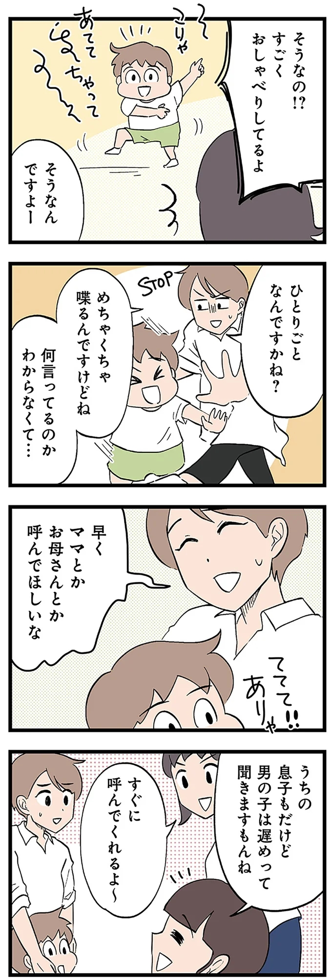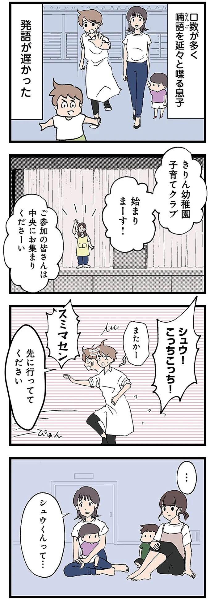一方で、他の子どもの発語を聞きシュウの発語の遅れが気になります。シュウは一応おしゃべりしているように見えますが、延々と理解できない喃語を続けるだけ…。