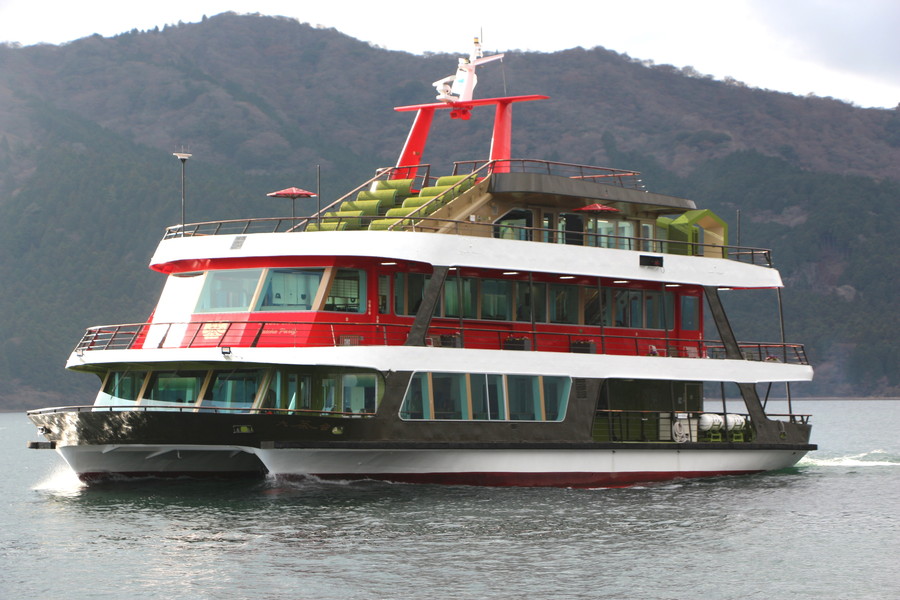 船は3階建てで全長28.8m、全幅11.6m、総トン数341トン。箱根関所跡港~元箱根港~箱根園港~湖尻港(約11.3km)で運行されています。