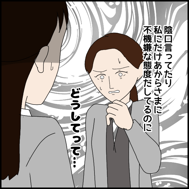 ある日、上司が黒沢さんの仕事の遅さを指摘。同調した赤木さんを、黒沢さんはいじめだと敵視するようになる。白山さんは仲を取り持とうとするが、なぜか赤木さんから「もっと黒沢さんをフォローして」と指導される。実は、黒沢さんは赤木さんに「白山さんが仕事を教えてくれない」と嘘をつき、両者を味方につけようとしていたのだった。