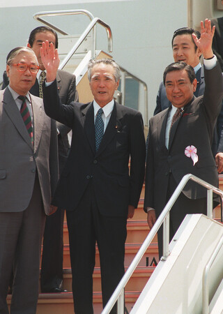 〔写真説明〕ナポリサミットへ出発する(左から)武村正義蔵相、村山富市首相、河野洋平外相=1994年7月6日、東京・羽田空港
