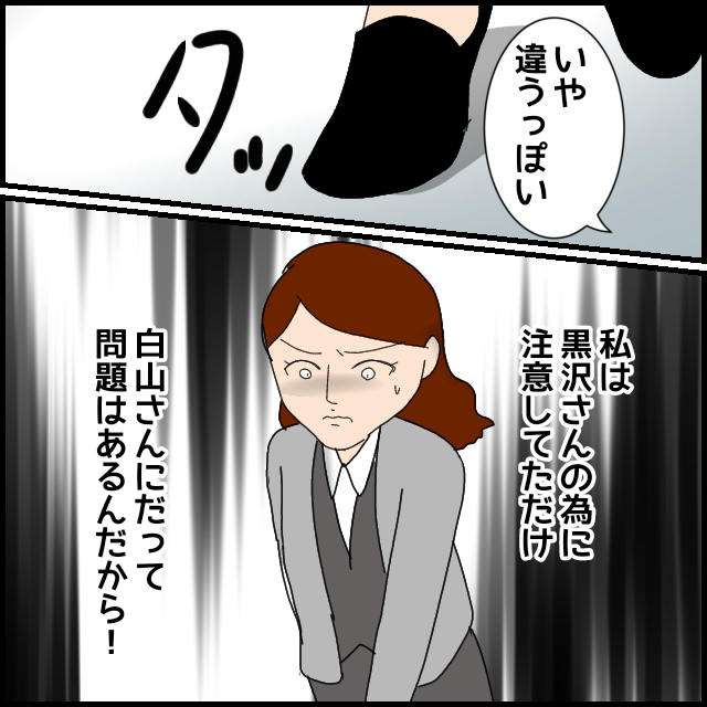 ある日、上司が黒沢さんの仕事の遅さを指摘。同調した赤木さんを、黒沢さんはいじめだと敵視するようになる。白山さんは仲を取り持とうとするが、なぜか赤木さんから「もっと黒沢さんをフォローして」と指導される。実は、黒沢さんは赤木さんに「白山さんが仕事を教えてくれない」と嘘をつき、両者を味方につけようとしていたのだった。