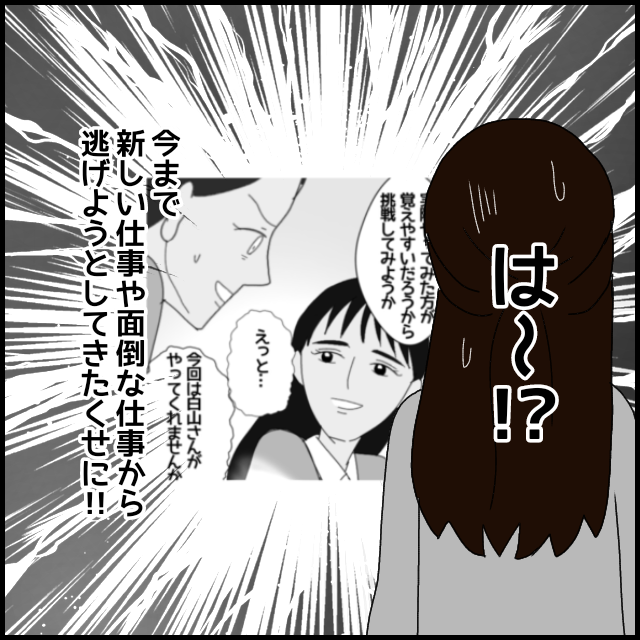 ある日、上司が黒沢さんの仕事の遅さを指摘。同調した赤木さんを、黒沢さんはいじめだと敵視するようになる。白山さんは仲を取り持とうとするが、なぜか赤木さんから「もっと黒沢さんをフォローして」と指導される。実は、黒沢さんは赤木さんに「白山さんが仕事を教えてくれない」と嘘をつき、両者を味方につけようとしていたのだった。