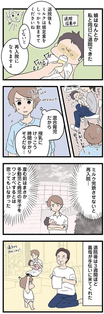 NICUから退院したユリの世話に追われるさくらは、多動児シュウの相手もままならず不安でいっぱいでした。義母が手伝ってくれていた退院後の3週間が過ぎると、ユリのお世話でシュウをかまえず、シュウの悪さも増加します。