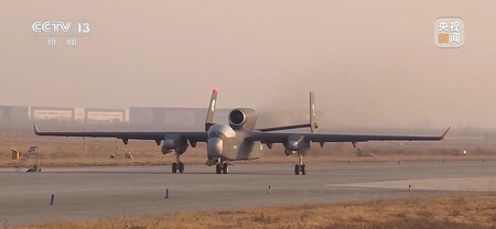 〔写真説明〕初飛行成功が報じられた中国軍の無人機「彩虹7(CH7)」=15日(中国国営中央テレビのサイトより・時事)