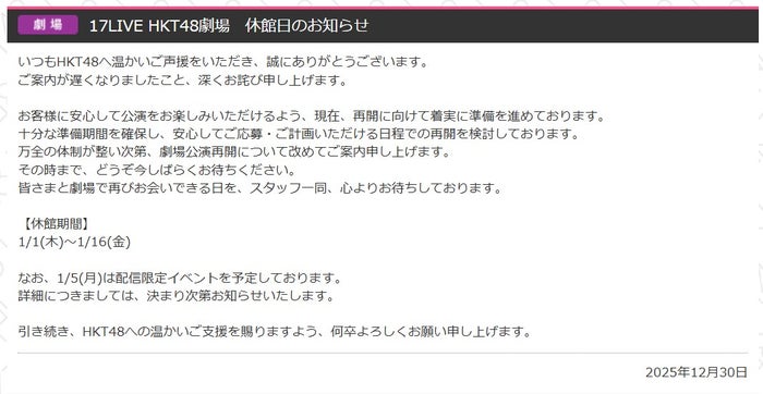 【モデルプレス=2025/12/30】HKT48の公式サイトが12月30日に更新され、「17LIVE HKT48劇場」の一時休館を発表した。 【写真】HKT48、ミニスカ衣装で美脚スラリ ◆HKT48、劇場一時休館へ 公式サイトでは、同劇場について「お客様に安心して公演をお楽しみいただけるよう、現在、再開に向けて着実に準備を進めております」と報告。「十分な準備期間を確保し、安心してご応募・ご計画いただける日程での再開を検討しております」と伝えた。 休館期間は1月1日から1月16日まで。「万全の体制が整い次第、劇場公演再開について改めてご案内申し上げます。その時まで、どうぞ今しばらくお待ちください。皆さまと劇場で再びお会いできる日を、スタッフ一同、心よりお待ちしております」と呼びかけている。なお、1月5日には配信限定イベントを予定していると発表した。 ◆HKT48男性スタッフ、刺傷事件で負傷 12月14日、福岡市中央区地行浜2丁目のペイペイドーム福岡に隣接する「17LIVE HKT48劇場」が入居している商業施設「BOSS E・ZO FUKUOKA」にて刺傷事件が発生。公式サイトでは、この事件により、男性スタッフ1人が負傷したことを報告したことを報告している。(modelpress編集部) ◆公式サイト全文 いつもHKT48へ温かいご声援をいただき、誠にありがとうございます。 ご案内が遅くなりましたこと、深くお詫び申し上げます。 お客様に安心して公演をお楽しみいただけるよう、現在、再開に向けて着実に準備を進めております。 十分な準備期間を確保し、安心してご応募・ご計画いただける日程での再開を検討しております。 万全の体制が整い次第、劇場公演再開について改めてご案内申し上げます。 その時まで、どうぞ今しばらくお待ちください。 皆さまと劇場で再びお会いできる日を、スタッフ一同、心よりお待ちしております。 【休館期間】 1/1(木)~1/16(金) なお、1/5(月)は配信限定イベントを予定しております。 詳細につきましては、決まり次第お知らせいたします。 引き続き、HKT48への温かいご支援を賜りますよう、何卒よろしくお願い申し上げます。 【Not Sponsored 記事】