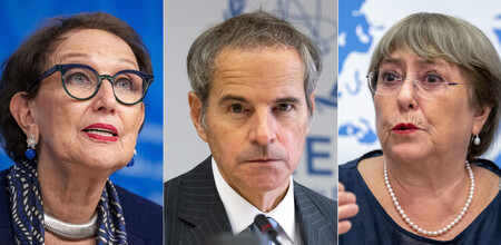 〔写真説明〕(写真左から)グリンスパン国連貿易開発会議(UNCTAD)事務局長、国際原子力機関(IAEA)のグロッシ事務局長、バチェレ元チリ大統領(AFP時事)